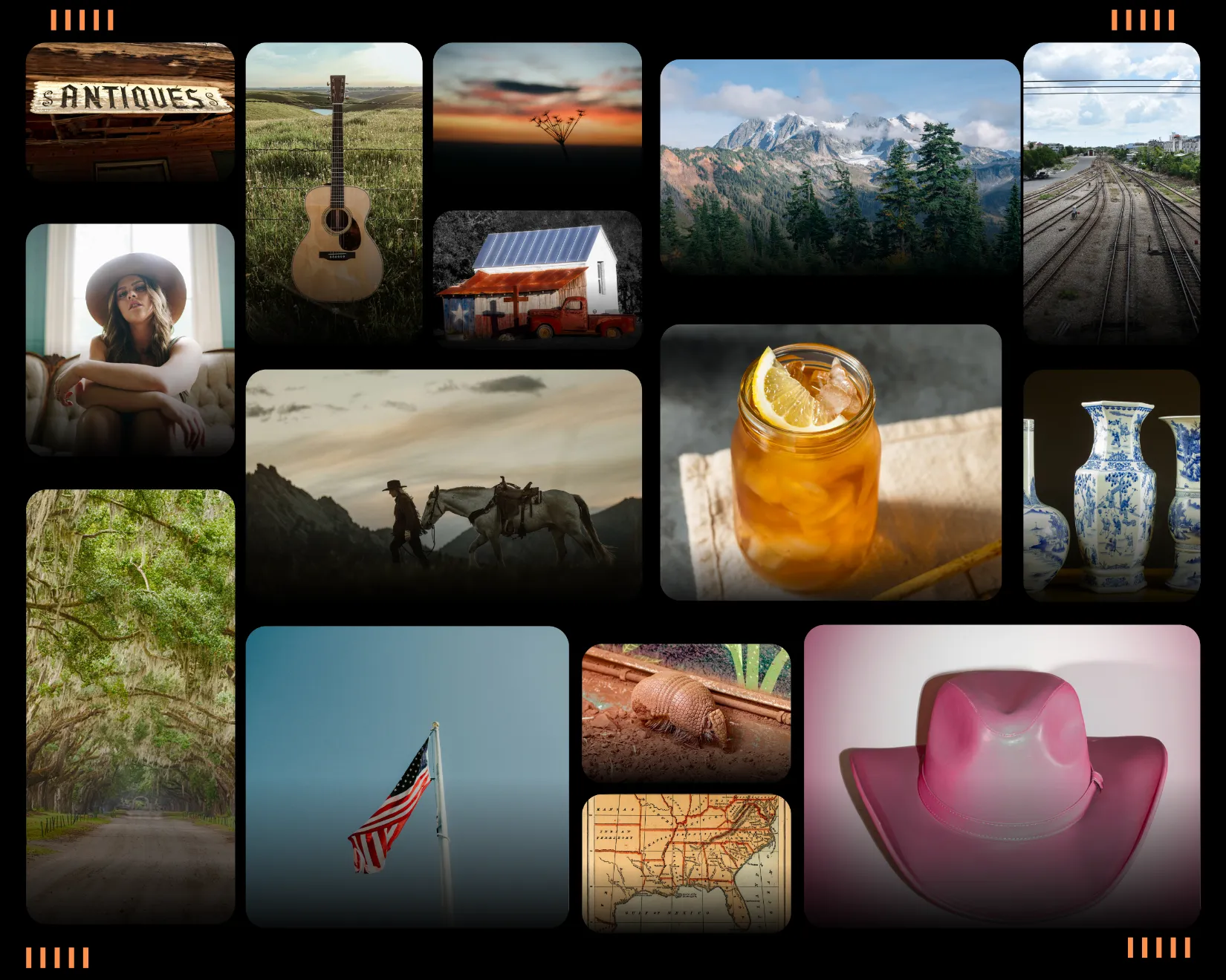 Collage of Southern culture including landscapes, sweet tea, guitars, and regional imagery